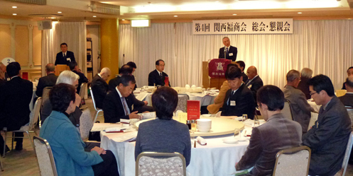 平成24年11月24日、道頓堀ホテルにて「第4回関西福商会総会・懇親会」が開催されました。関西支部の皆さまの他、福井本部より会長以下22名、関東福商会より4名、東海福商会より2名、福井県大阪事務所長やふるさと営業課長補佐など総勢63名が出席しました。岩井幹事が開会を宣言し、物故者および濱出氏への黙祷のあと牧野会長が開会の挨拶。その後議事にはいり議案はすべて承認されました。